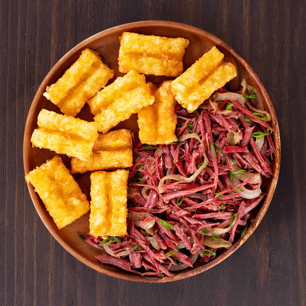 Receita de Jerked Beef Acebolado com Mandioca Frita